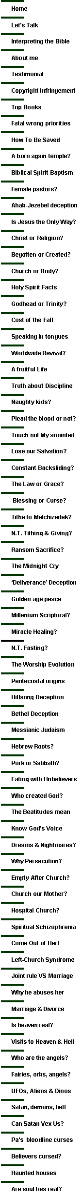 Eating Pork and Keeping the Sabbath? Is Jesus the Only Way to be saved or can people be saved ‘by the light they received?’ The ransom price to pay Satan or Jesus Choice to Fulfill the whole Law? The Biblical Baptism with the Holy Spirit Is the gift of speaking in tongues the ’evidence of the Holy-Spirit baptism? ‘THE THOUSAND YEAR PEACE,’ SATAN’S CAPTURE AND RELEASE? The GATES OF HADES (NOT ‘HELL’) will NOT PREVAIL Is Heaven a Real Place or just a state of mind? Extra revelations of heaven and hell? New Testament Tithing & ‘Giving’ to ‘buy’ God’s blessing Tithe to Melchizedek? How to live fruitful in the Kingdom of Jesus Christ Blessing or Curse the Choice is Yours How to follow Jesus in a New Life: The Law, Grace, or the Moral Law? Touch not God’s Anointed — who are you to judge? Þ The Great ‘Deliverance’ Deception Þ Great, Irreconcilable Differences between Psychiatry and Scriptural Truth Þ How to Sever Personal Relationships with Satan Þ The Power of Praise in Deliverance from Affliction Þ Psychopath Freaks that Deceive and Control us · Jehovah’s Witnesses (or Russellites) and Masonic Orders; the Bible and the Watchtower |