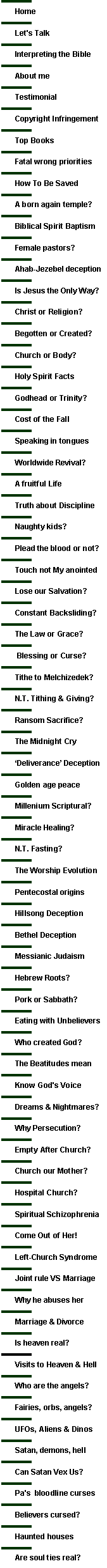 In Luke 16:19-31, Jesus described how the rich man and Lazarus irrespectively went directly to hell and heaven when they died. When the rich man asked Him to send someone from hell to warn others that they may repent to escape that terrible torment, He replied, "No... [even if] someone [were allowed to go] from the dead, [either from hell or heaven,] they have the [truth of Scripture,] let them listen to [God's Word.] If they do not listen to [My Word,] neither will they be persuaded though one [might] rise from the dead, [or come back from heaven or hell.]" This brings us to the second important question. Jesus clearly said decided sinners will not be “persuaded” to repent from sin and follow Him through the truth of Scripture, even though someone rises from the dead to warn them. So, how can extra-Scriptural ‘revelations’ of heaven and hell, and even ‘messages’ from heaven and hell, now suddenly achieve that? In the Old Testament (Eccl. 9:5-8,) Jesus also declared plainly, "The dead [are either in heaven or in hell] and know nothing [of what is happening on earth.] They have no more reward... Nevermore will they have a share in anything done under the sun." Only at the return of Jesus, at the resurrection of their physical dead bodies from their physical graves, will the righteous dead come back to earth to inhabit their glorified, risen bodies to go to heaven with Jesus. The unrighteous dead will also be resurrect to inhabit their ever-living bodies, to be tortured forever in hell, (1 Ths. 5:23; 4:13-18; 1 Cor. 15:35-49; 1 Tim. 1:3-6.) Þ Where Paul wrote in Scripture he visited heaven, he related only one valuable lesson for us: extra-Scriptural revelations of heaven are forbidden! He wrote in 2 Cor. 12:4 that he heard words in heaven, “which are not lawful for a man to utter.” If indeed Paul saw anything in heaven, that too, must have been “unlawful” to tell, because he did not breathe a single word about extra-Scriptural ‘revelations’ of heaven. Jesus did, can, and will resurrect the dead, (Mark 5:39-42; Acts 9:36-42; Ths. 4:16-17; ) But during Jesus’ time, and since He ascended into heaven, none of those, not even Paul or anyone else who died either with, or without Christ, came 'back' from heaven or hell with 'new revelations' of the afterlife, (2 Cor. 12:4 ) Extra-Scriptural revelations of heaven and even hell are new phenomena. The first believers all knew Jesus can raise people from the dead, but they never heard the stories we are hearing now, in the end time, where Jesus warned, deception rules Christianity, (Mt. 24:24-29.) Þ Everything we need to know about heaven and hell was taught by Jesus Himself and recorded in the truth of His Word. The Man Jesus Christ was the last and final prophet where extra-Scriptural revelations are concerned, (Heb. 1:1-14.) This demands another important question. Since when are the truth of Jesus’ Word, the conviction of the Holy Spirit, and the preaching of His Gospel not sufficient in bringing people to faith in, and obedience to Him? (Heb. 1:1-14; Jn. 16:8-9.) Paul declared in Rom. 10:17-18, “Faith comes by hearing [the truth of God’s Word.] The words of [true preachers] have gone out to ends of the world.” When people are convicted of sin and convinced of God’s Truth by the Holy Spirit, the preaching of His truth, not extra revelations from heaven and hell, brings them to faith and repentance. Þ Yet, in defiance of God's Word, among the many extra-Scriptural 'revelations,' there are even accounts of those who supposedly came back from hell to tell how believers in Christ are eternally tortured because they "did not pay their tithes and attend all the church meetings!" (2 Cor. 9: 5,7; Rev. 18:4.) This is completely false. According to the truth of God’s contextual Word, going to hell for “disobeying” false dogmas that twist God’s Word and abuse Jesus’ believers to extort money form them to allegedly ‘buy’ their “inherited blessed state or spiritual position inside the Kingdom of God by paying ‘tithes, is simply impossible, (Gal. 3:10-14; 1 Pt. 2:9-10; Col. 1:13-14.) On the other hand, those who unrepentedly teach such false doctrines to abuse God, His Word, and believers, will surely go to hell, (1 Jn. 2:3-5.) Spiritually born again believers belong to the New Testament Covenant of Grace, not to the ousted Old Testament Covenant of the Hebrews, (Heb. 8:13 - chapters 7-9.) Tithing is not a New Covenant mandate, (2 Cor. 9:5 & 7.) Tithes (plural) were the taxes of the Governmental Priesthood of the Old Testament's physical temple! Besides, the man-made "church" system opposed to the spiritual body of Christ, (true believers,) is so incredibly corrupt, Jesus commanded His disciples to "come out of her, lest you receive of her plagues!" (Rev. 18:4.) So, why would Jesus send believers to hell for not attending their false church meetings? It is clear that such people are really 'from hell,' because they preach false doctrine and do not understand that true believers must "test and prove everything" to see if it is of God! (1 Ths. 5:21; 1 Jn. 4:1-4.) Relating articles: A thousand year peace on earth; Satan’s capture and release? Is Heaven a Real place or just a State of Mind? Is Hell a Real place or just a State of Mind? The Time is at hand: The Five Wise and the Five Foolish Virgins at the Midnight Cry Astro Projection, Astro Travel, and Near Death Experiences Dreams, Nightmares, Visions, and the Gifts of the Holy Spirit Difference Between the Kingdom of God and the Kingdom of Heaven